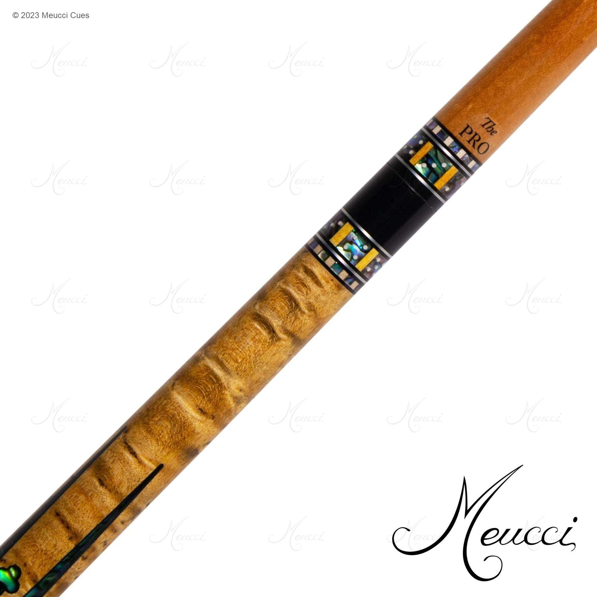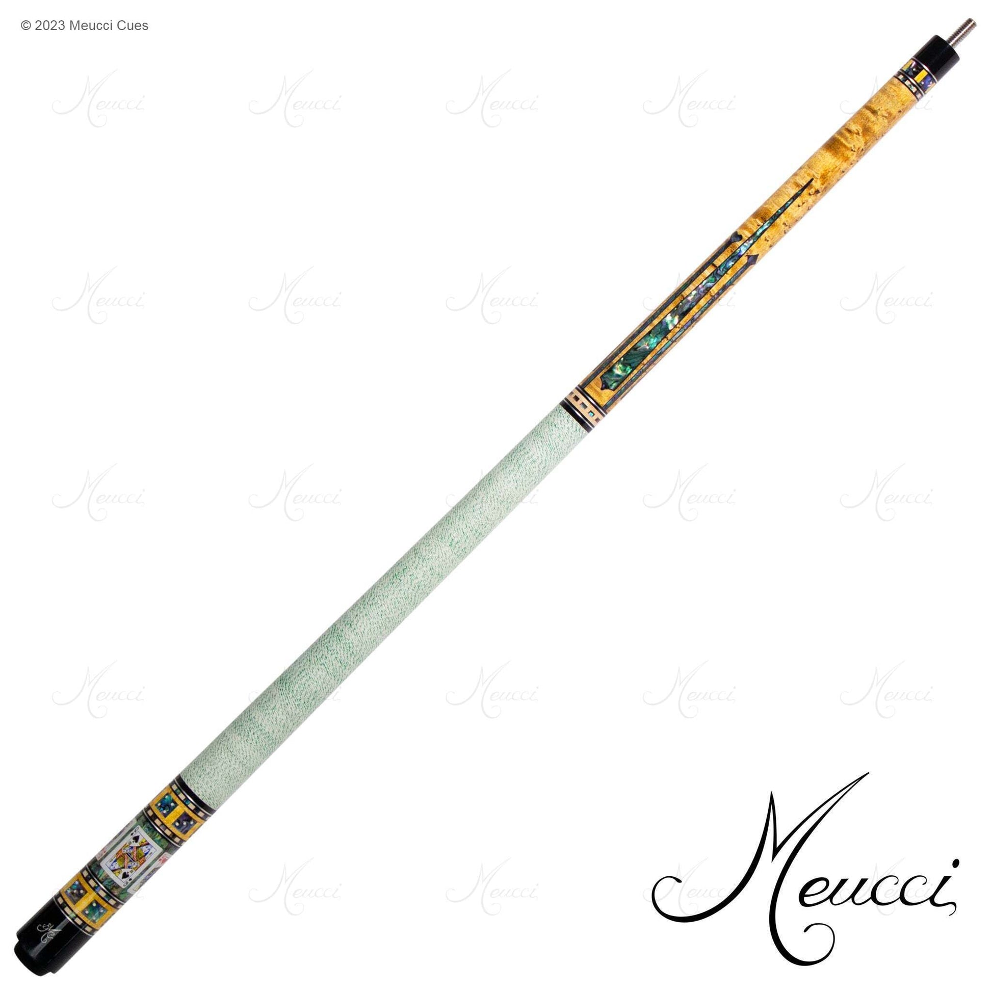 The urethane-coated natural Irish linen wrap and distinctive buttsleeve design featuring a 4 card royal flush in spades over genuine Paua Shell, trimmed with black on each side, make this cue a unique addition to any game room.